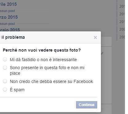 Selezionando la voce “Segnala/rimuovi tag” non abbiate l’illusione di poter di fatto rimuovere il tag. Questa opzione in realtà vi conduce all’interno di un menu che vi invita ad aiutare gli amministratori a capire quale sia il problema, indagando le ragioni che vi spingono a desiderare la rimozione del tag. Vi verranno infatti poste alcune domande, ciascuna delle quali a propria volta farà scaturire domande ulteriori fino a quando non vi verrà suggerito l’invio di una richiesta di rimozione del tag direttamente alla persona che l’ha applicato, laddove non sarete esortati a rimuovere la persona in oggetto dai vostri contatti (cosa che comunque NON servirà a eliminare il tag “incriminato”, il quale resterà indisturbato sulla bacheca di questa persona, fruibile dai suoi contatti, fintantoché essa lo vorrà).
