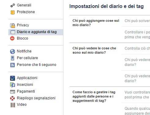 Per attivare questa funzione dovrete accedere alle impostazioni tramite il triangolino rovesciato che appare dopo il simbolo del lucchetto nella barra di navigazione blu, e da lì selezionare la voce “Diario e aggiunta di tag” (nella consueta lista di opzioni alla sinistra della pagina).