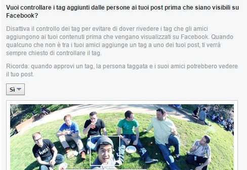 Troverete un “No” come risposta a questa domanda (perché come al solito la piattaforma sarà impostata in modo neutrale, cioè senza restrizioni da parte vostra); voi invece dovrete cliccare sul pulsante “Modifica” e selezionare come risposta “Sì“. A questo punto, ogni volta che qualcuno tenterà di apporre un tag a post da voi pubblicati riceverete una notifica di questo tentativo, notifica dalla quale approverete il tag oppure lo ignorerete. Ignorandolo esso non verrà in alcun modo applicato.