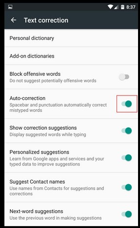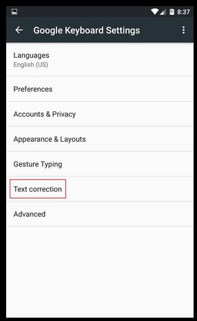 Se non si dispone di una tastiera stock di Android, per prima cosa è necessario individuare la tastiera di Google (ammesso che sia installato sul telefono), e aprirla. Una volta fatto questo, si vedrà il sottomenu “correzione di testo” che abbiamo menzionato sopra, e, dopo l’accesso, è possibile ancora una volta disabilitare l’auto correzione con un solo tocco. Inutile dire che, se si vuole, è possibile attivare la funzione di nuovo e in qualsiasi momento.