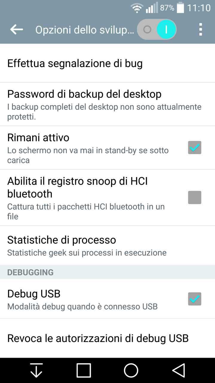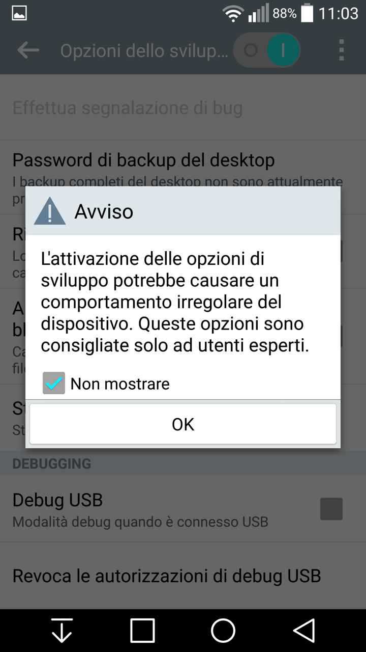 - Abilitate il Debug USB che trovate nelle opzioni dello sviluppatore e collegate il telefono al PC. Se non trovate la voce Opzioni dello Sviluppatore dovete abilitarla entrando in Info sul Telefono==>Informazioni sul Software e fate dei tap ripetuti su Numero di Build fino a che non compare il messaggio di abilitazione avvenuta