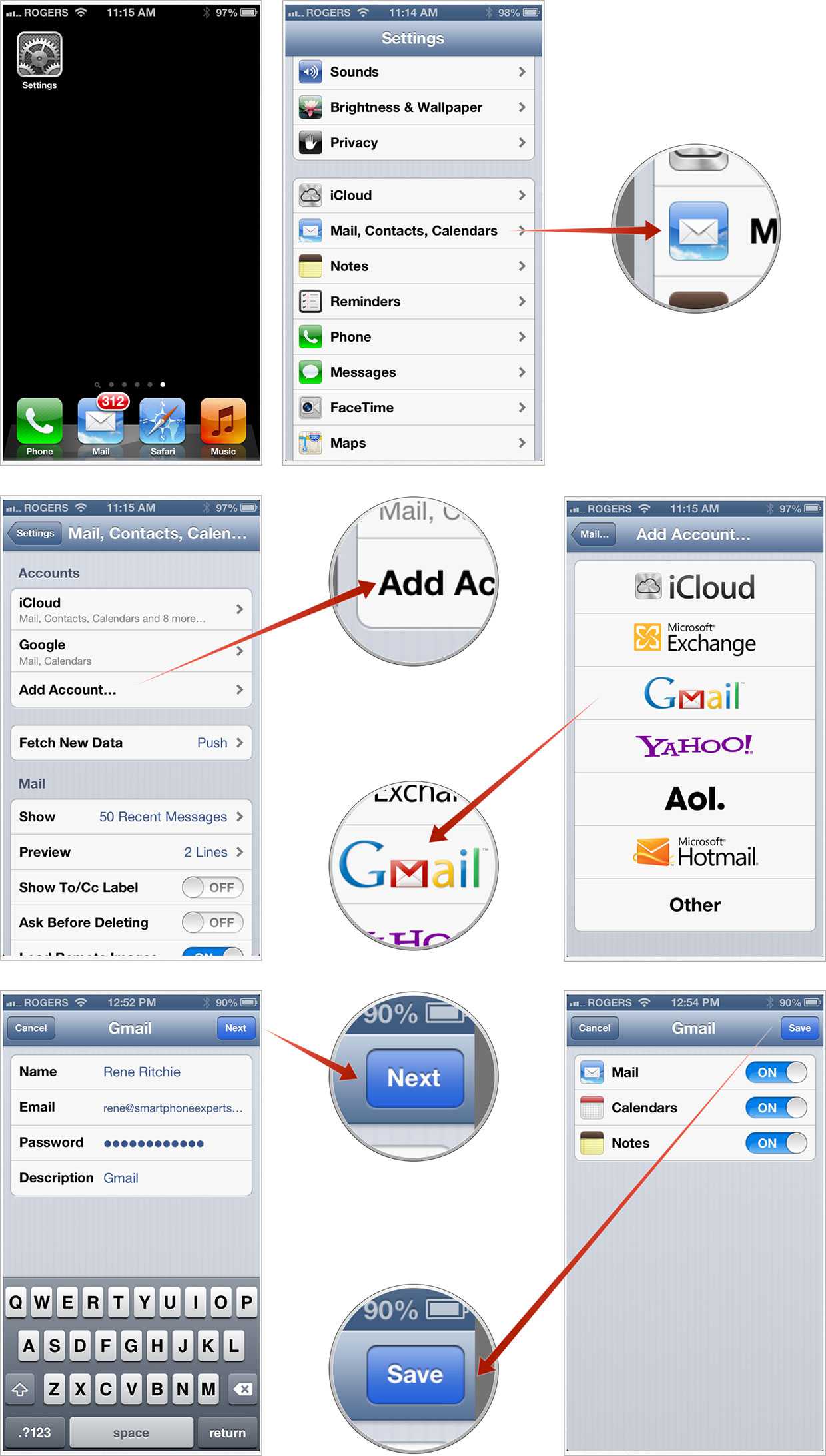 Gmail è una delle principali opzioni di installazione mail dell’applicazione di Posta del sistema iOS di Apple. Per ricevere la posta utilizza IMAP, ma per via della configurazione non-standard di Google e della mancanza di supporto specifico da parte di Apple per tale configurazione non-standard, non include push-email né accesso a classificazioni, etichette e altre convenzioni proprie di Gmail. Tristemente, nemmeno prevede la sincronizzazione automatica dei contatti, e quindi bisognerà impostarla separatamente.