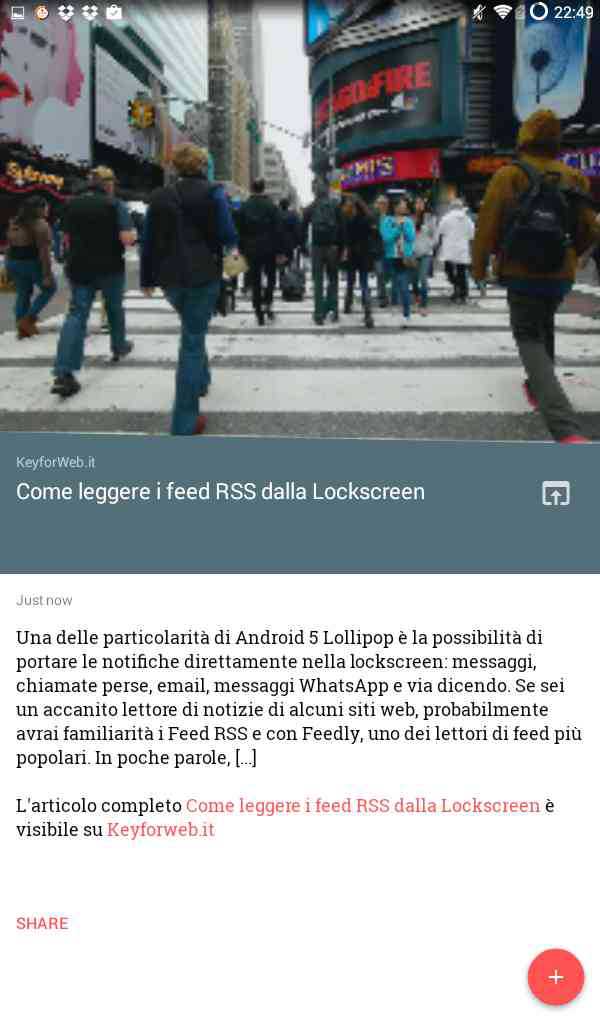 Una delle particolarità di Android 5 Lollipop è la possibilità di portare le notifiche direttamente nella lockscreen: messaggi, chiamate perse, email, messaggi WhatsApp e via dicendo. Se sei un accanito lettore di notizie di alcuni siti web, probabilmente avrai familiarità i Feed RSS e con Feedly, uno dei lettori di feed più popolari. In poche parole, la sottoscrizione ai Feed RSS di vari siti web tutti a portata di mano in un unico lettore, tutte le news aggiornate li, a portata di mano.
