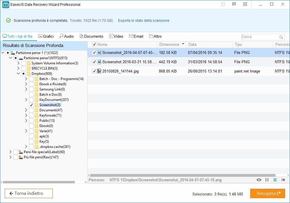 Una terminata la scansione dell’hard disk, anche l’operazione di ripristino sarà estremamente semplice: sarà infatti sufficiente selezionare le cartelle od i singoli file da recuperare e premere il tasto “Recupera”. A questo punto sarà necessario selezionare una cartella, su un hard disk differente da quello oggetto della scansione, dove ripristinare i file ed il sistema procederà al recupero.
