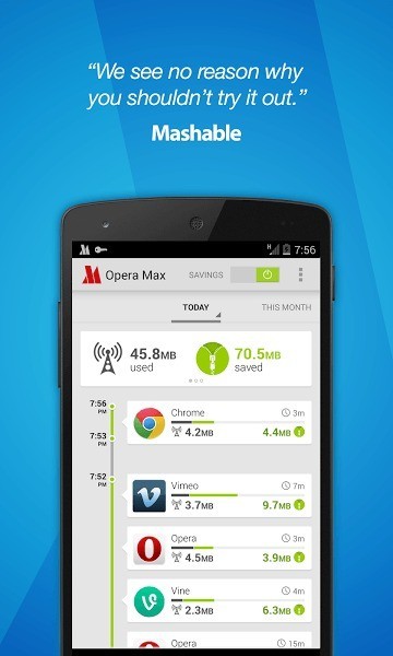Opera MAX è un gestore dati potenzialmente in grado di ridurre i dati utilizzati dalle app sul vostro telefono. Funziona comprimendo dati in entrata di vario genere, filmati compresi: si dice infatti che sia capace di ridurre le dimensioni di un video di 10MB fino a soli 3MB, sebbene ne faccia le spese la qualità, ovviamente. La cosa positiva è che l’applicazione è gratuita, dunque non potete proprio esimervi dal testarla (l’importante è che teniate conto del fatto che il servizio è ancora in fase beta e che potrebbe non funzionare in maniera perfetta).