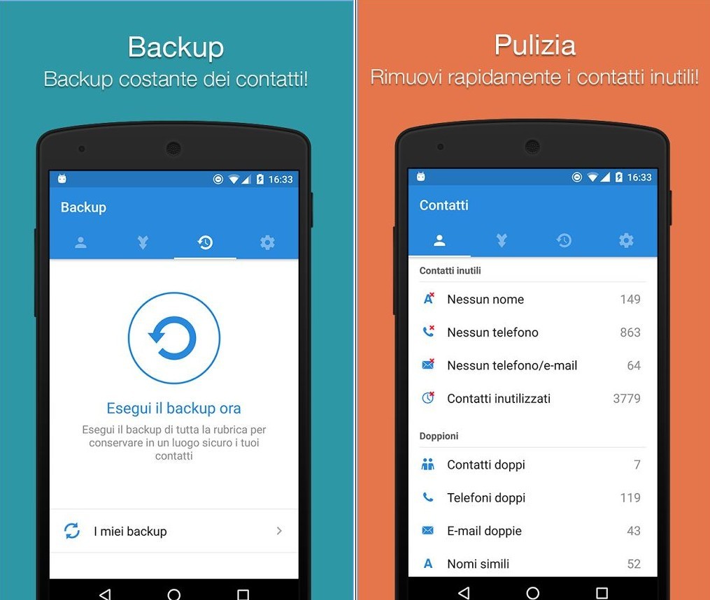 Eseguita la scansione potrete eseguirla una pulizia immediata dei contatti, potrete eliminarli oppure fonderli in una sola scheda, allo stesso tempo anche eseguire dei backup, giusto per sicurezza, ed eventualmente ripristinarli. Anche in questo caso quindi una soluzione rapida e perfetta anche per chi è meno esperto.
