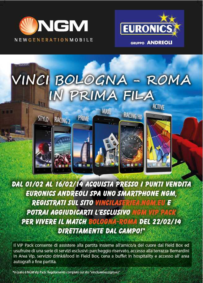 27 gennaio 2014 – NGM, leader in Italia nella telefonia Dual Sim e ANDREOLI SpA del Gruppo EURONICS, insegna di riferimento nazionale per la distribuzione di elettrodomestici ed elettronica di consumo, regalano un’esperienza da sogno per ogni appassionato di calcio. Il concorso “CON NGM E ANDREOLI EURONICS VINCI BOLOGNA ROMA IN PRIMA FILA” mette in palio 8 esclusivi NGM VIP Pack per vivere insieme all’amico/amica del cuore la partita Bologna-Roma del 22 febbraio 2013 direttamente dal campo, con un servizio completo di hospitality e la possibilità di incontrare i propri campioni del cuore. Una prospettiva esclusiva per vivere la sfida nella sfida: Totti contro Diamanti; la Roma che insegue il vertice della classifica, il Bologna alla ricerca di preziosi punti per la lotta salvezza.
