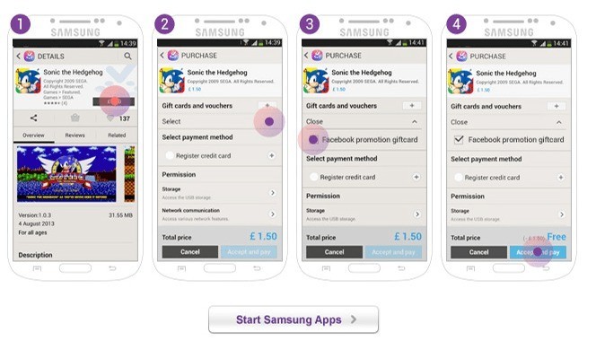 Per poter usufruire del buono da 3.78€ sarà sufficiente collegarsi con la propria utenza Samsung utilizzata durante il concorso, al Samsung App Store attraverso il proprio dispositivo Android, ed una volta scelta l’applicazione desiderata indicare la scelta di utilizzare il premio vinto per il pagamento, come nell’esempio che troverete qui sotto:
