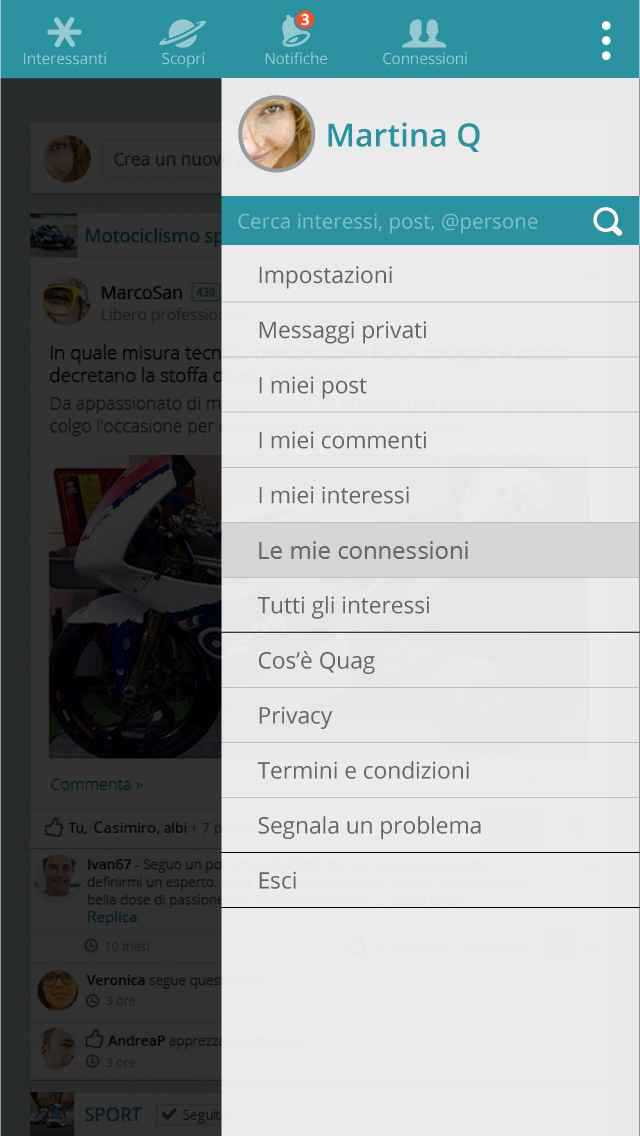 Tutti i post e gli interessi degli utenti sono pubblici, così da facilitare l’identificazione di persone affini. Su quag.com è inoltre possibile creare la propria rete sociale di connessioni e rimanere più facilmente in contatto con gli utenti d’interesse. Quag offre aggiornamenti costanti sui post pubblicati dalle proprie connessioni: l’intento è quello di creare e consolidare nel tempo legami di valore sul social basato sugli interessi.
