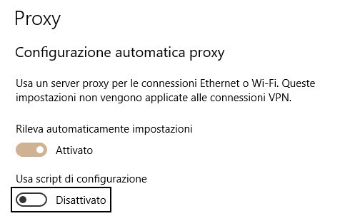 A questo punto passiamo alla procedura per la disabilitazione del WPAD. Fortunatamente non è niente di così complicato, anzi basterà digitare una semplice frase all’interno della barra di ricerca di Cortana e procedere alla disattivazione. Spostatevi quindi sulla barra di ricerca, come detto, e digitate “Configurazione automatica proxy“. Vi verrà dato un risultato, cliccateci sopra. A questo punto vi ritrovate all’interno delle impostazioni di “Rete e Internet“. Spostatevi all’interno della scheda a destra e disattivate la voce “Rileva automaticamente impostazioni“. Fatto questo semplice passaggio sarete riusciti ad evitarvi un bel problema e potrete navigare in modo più sicuro, ma fate sempre molta attenzione in ogni caso.
