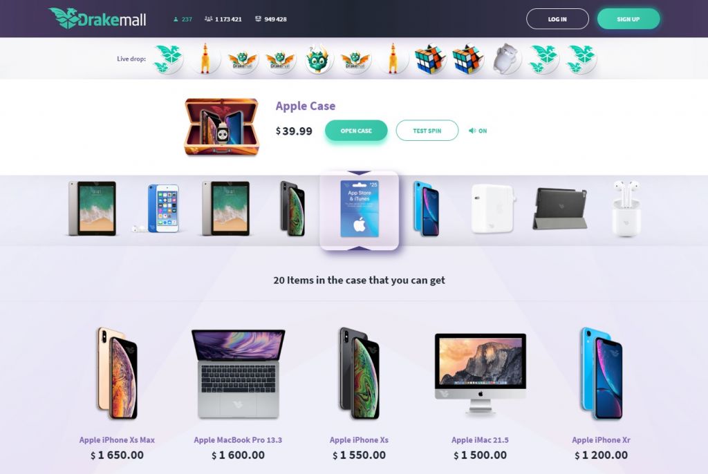 Come detto, tutto varia in base alla valigia che sceglierete di acquistare, prima, e di aprire, poi. Volete puntare sulle Apple Case? Bene, tutto è molto semplice. Prima di tutto, il costo: servono 39,99 dollari per poterla comprare e aprirla. Caricate il portafoglio e fate un click su Open Case. Nel caso in cui vogliate prima dare un’occhiata a come avvenga l’estrazione del premio, allora cliccate sul tasto “Test Spin” e avete delle free spin. Una vera e propria occasione da non lasciarsi sfuggire per vincere prodotti molto costosi al prezzo più basso di sempre! La Apple Case presenta al suo interno prodotti che tutti conosciamo e che fanno sempre gola. Chi non vorrebbe finalmente mettere le mani sul nuovissimo Apple iPhone Xs Max, lo smartphone con lo schermo più grande mai realizzato da parte del colosso di Cupertino? Anche l’Apple MacBook Pro 13.3 fa decisamente gola, per non dimenticare il nuovissimo iPhone Xs e l’Apple Mac 21.5. Teniamo presente che sono tutti prodotti che hanno un valore di mercato superiore a 1500 dollari: grazie a DrakeMall e ad una buona dose di fortuna si potrebbero portare a casa con soli 39,99 dollari. Sembra incredibile, ma è tutto vero: guardate anche questo filmato su YouTube e provate ad immaginare a come potrebbe essere scoprire all’interno della valigia che avete comprato un premio come l’Apple iMac o l’orologio smart Watch Series 4 o anche solo un “semplice” iPad 9.7!