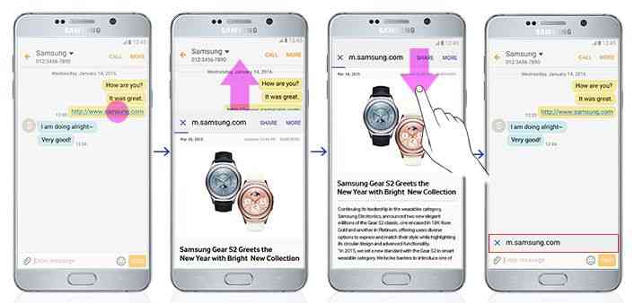 Per cominciare Samsung introduce direttamente la nuova versione del browser stock Samsung che successivamente sarà possibile anche scaricare separatamente dal Play Store; la versione 4.0 porta con se le ultime specifiche per gli sviluppatori di oggi, segnando il massimo dei voti su HTML5 test di compatibilità dal World Wide Web Consortium. L’altra novità interessante riguarda la nuova funzionalità Cross App: sarà possibile interagire con altre app partendo da quella che stiamo utilizzando, da qui il termine “cross”. Attualmente già possiamo farlo tramite ad esempio whatsapp: un messaggio contenente un link ci da la possibilità di aprirlo direttamente nel browser predefinito e passando direttamente alla navigazione attraverso l’app precedente.