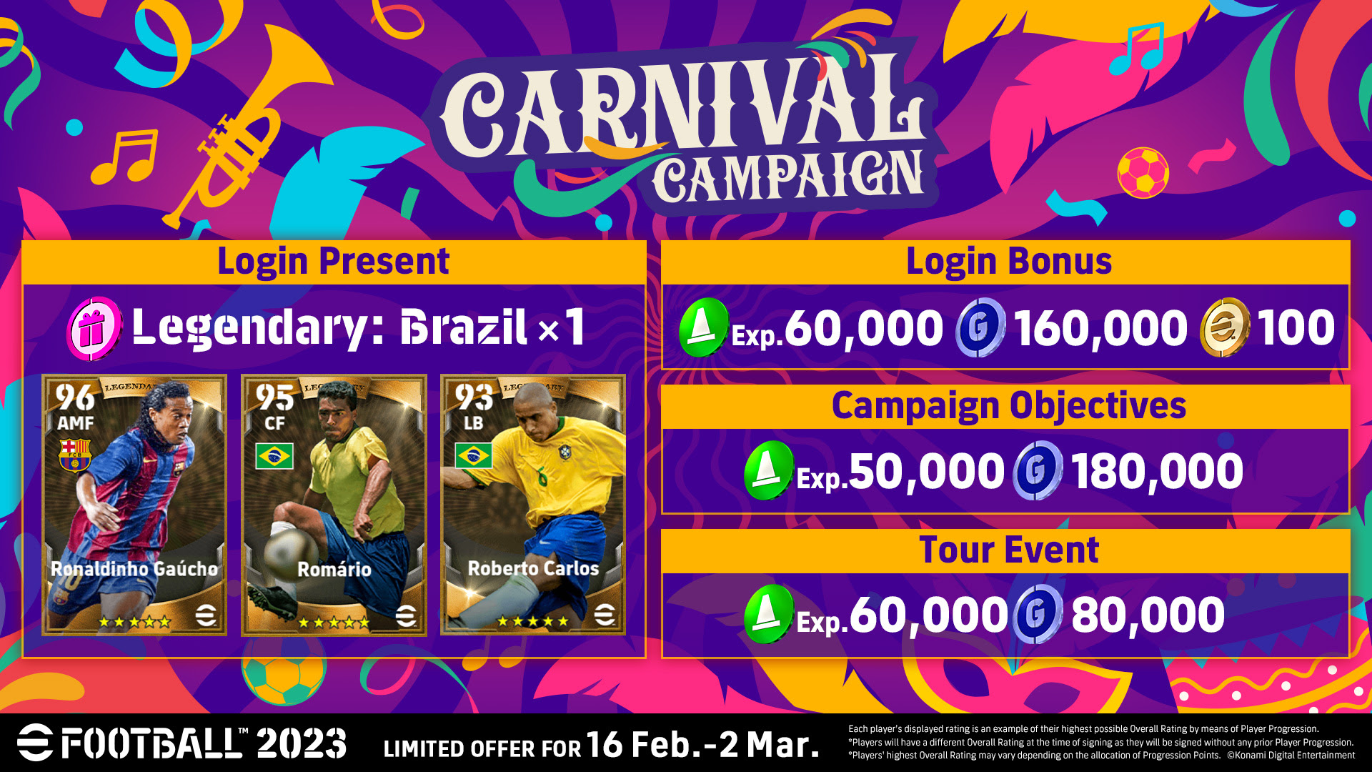 Conclusa l’accesa competizione tra squadre internazionali, la Stagione 3 di eFootball™ 2023, “Back to the Clubs”, continua con una serie di campagne ed eventi in-game per celebrare il Carnevale e l’inizio della stagione della J-League. eFootball™ 2023 abbraccia la vibrante festa del Carnevale e offre esclusivi bonus log in che permetteranno l’acquisizione tramite un Accordo al Buio Leggendario di una leggenda del calcio brasiliano per il proprio “Dream Team”!