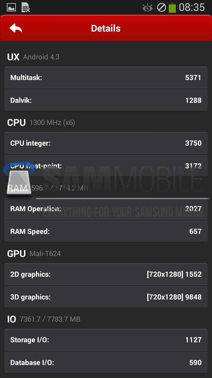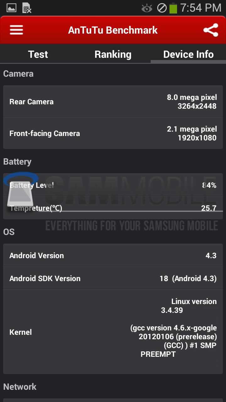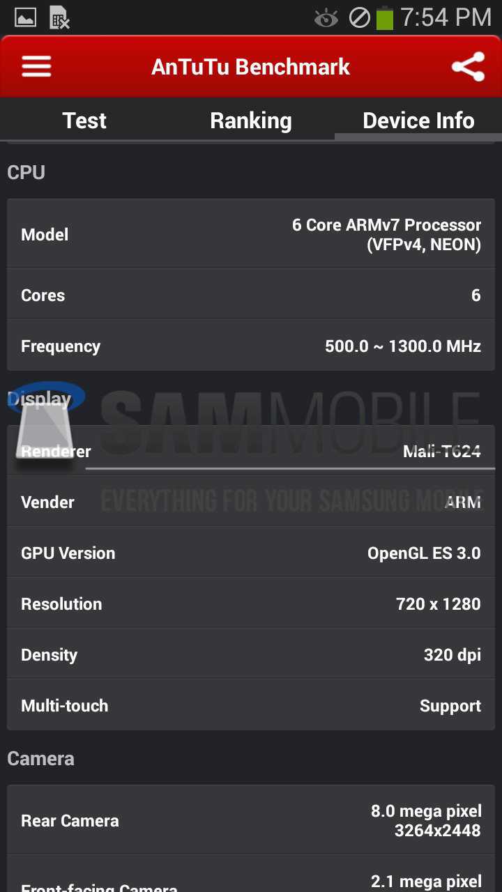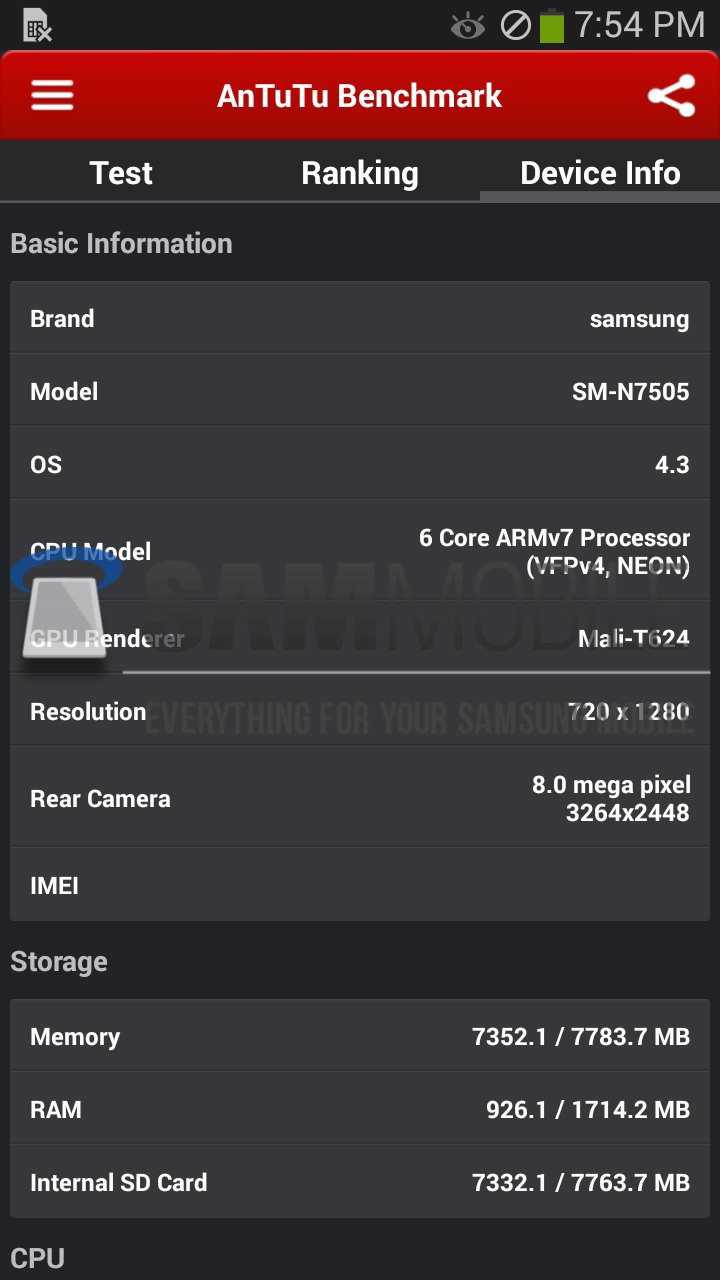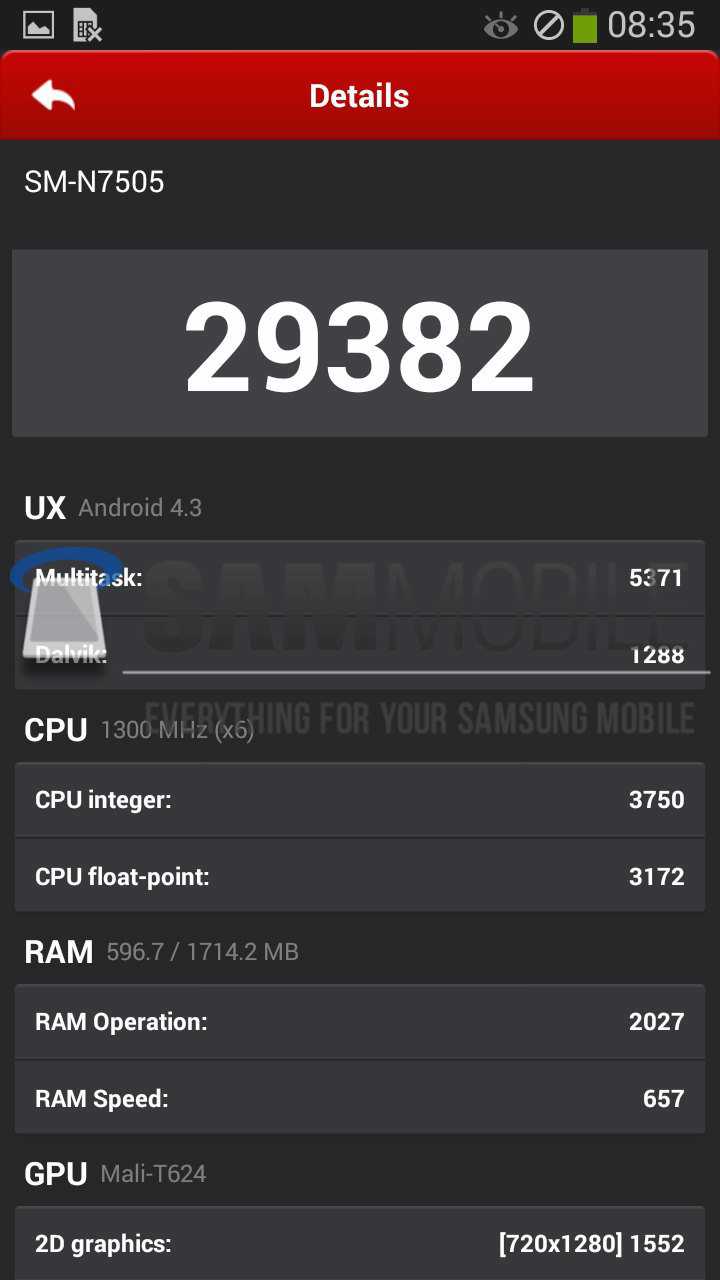 Il Samsung Galaxy Note 3 Lite sarà disponibile in due varianti, HSPA + (SM – N750) e LTE (SM – N7505) . Il dispositivo sfoggia uno schermo HD da 5,55 pollici con risoluzione da 1280 x 720 Super AMOLED con una densità di pixel di 265PPI, 2GB di RAM, 8 Megapixel per la fotocamera posteriore in grado di girare video Full HD 1080p , 2.1 Megapixel Full HD per la fotocamera frontale per effettuare chiamate video. Il comparto della memoria interna ospita 16GB espandibili tramite MicroSD e, per quanto riguarda la batteria troviamo un’ottima 3.100 mAH. Le prove effettuate da SanMobile sono state eseguite con la versione LTE che  dispone di una CPU Hexa -Core con ARM Mali- T624 GPU.
