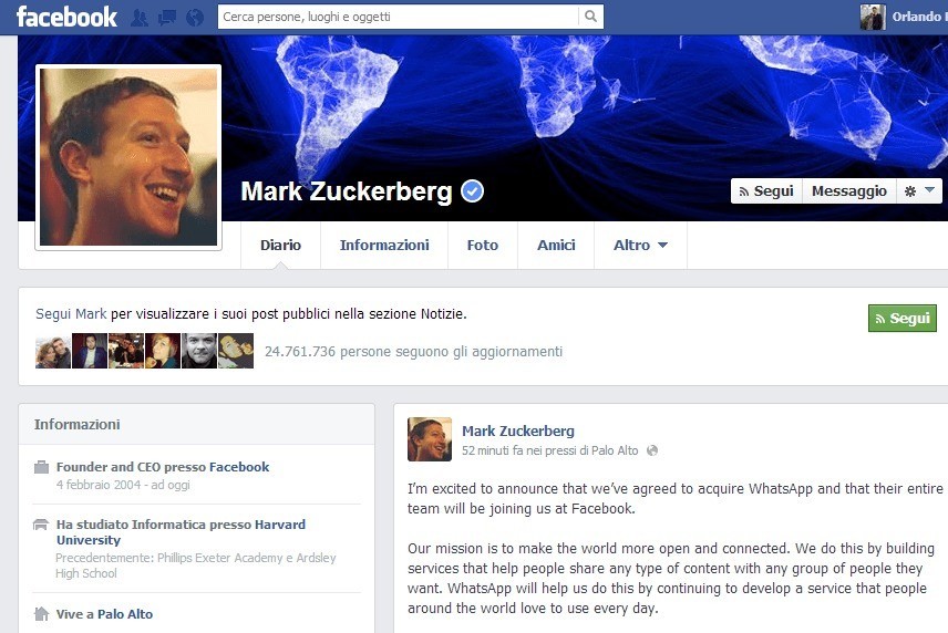 “Sono entusiasta di annunciare che abbiamo deciso di acquisire WhatsApp e che l’intero team si unirà a noi su Facebook .