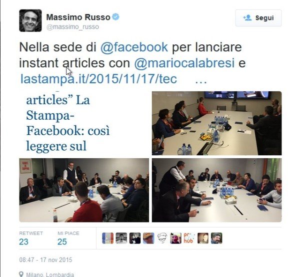 Sbarcano anche in Italia grazie a La Stampa, gli Instant Articles di Facebook . L’annuncio è stato dato durante una conferenza stampa dal direttore de La Stampa Mario Calabresi e il responsabile per l’Italia di Facebook Luca Colombo, nella sede milanese della società. All’incontro ha preso parte in una videoconferenza da New York anche il direttore globale delle media partnership per Facebook, Andy Mitchell.