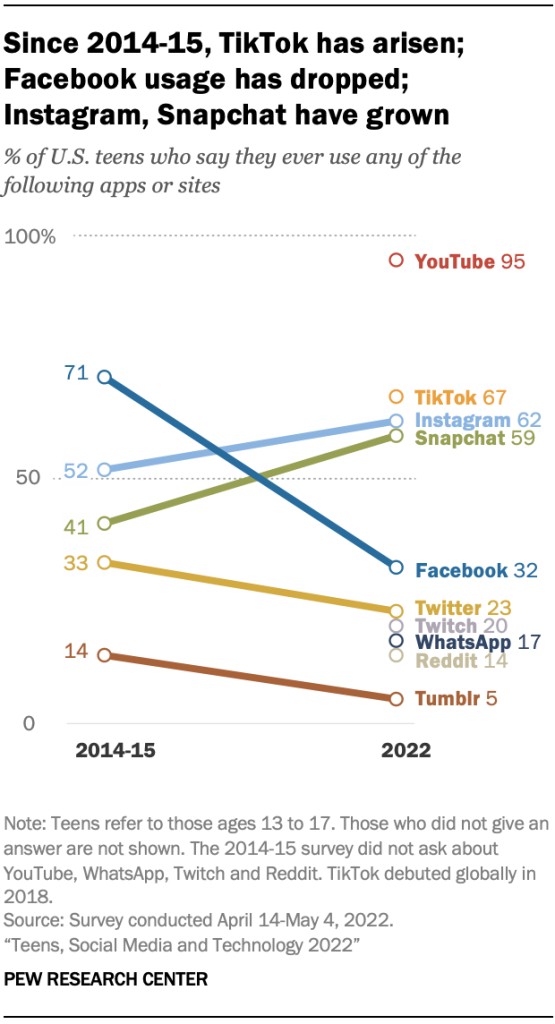 Un sondaggio del Pew Research Center su adolescenti americani di età compresa tra 13 e 17 anni rileva che l’utilizzo di Facebook è in calo e molti stanno migrando verso le app multimediali come TikTok e YouTube.