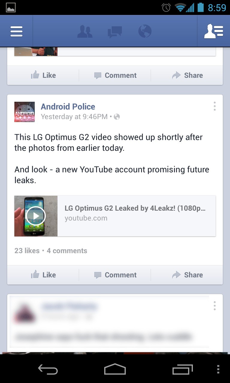 A nostro avviso, sicuramente la nuova interfaccia potrebbe semplificare l’utilizzo di Facebook per i neofiti del mondo Android ma non concordiamo nella scelta del layout in quanto non corrisponde con quanto indicato da Google nelle proprie linee guida (ad esempio Google preferirebbe che i tab fossero nella parte alta dello schermo) e questo potrebbe generare confusione, così come la scelta di utilizzare la nuova barra di navigazione toglie ulteriormente spazio sul display soprattutto in quei device quali i Google Nexus in cui anche i tasti fisici vengono sostituiti con quelli virtuali on screen.