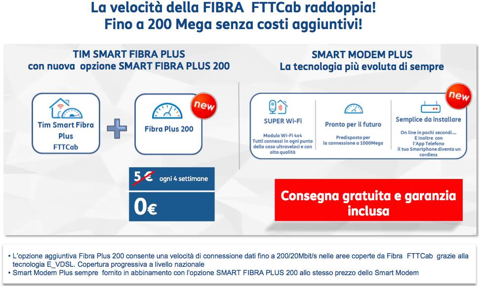 TIM è finalmente pronta a dare una nuova spinta alla Fibra Ottica Italia con il suo nuovissimo servizio TIM Smart Fibra Plus 200. Chi ci segue saprà infatti per certo che da tempo l’operatore telefonico sta facendo di tutto per riuscire a garantire una velocità superiore ai suoi clienti da tempo fermi ai canonici 100 mega che poi non vengono quasi mai raggiunti.