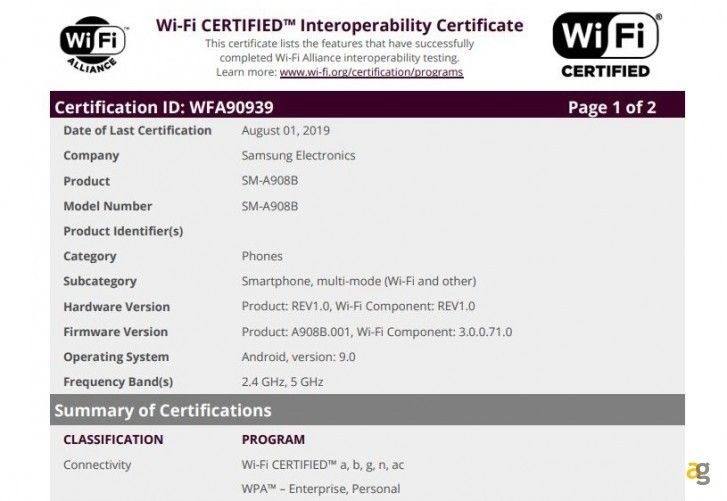 Il dispositivo ha ricevuto infatti la certificazione nella giornata del 1° Agosto dalla WiFi Alliance. Il modello certificato porta il nome in codice “SM-A908B”, già apparso in precedenza sul web grazie ad altri avvistamenti.