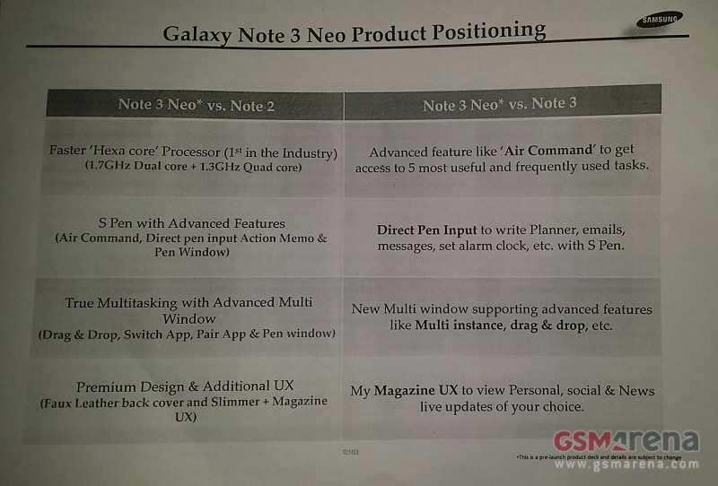 Grazie alle informazioni raccolte dal famoso sito GSMArena oltre al nuovo nome scelto da Samsung scopriamo che questo Galaxy Note 3 Neo sarà il primo smartphone della casa coreana dotato di un processore esa-core, con due core da 1.7 GHz e quattro core da 1.3 GHz, con il resto delle specifiche comunque di ottimo livello.