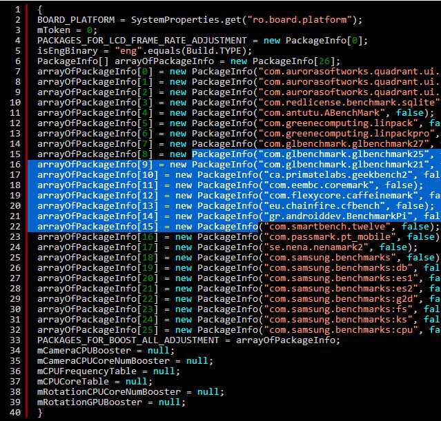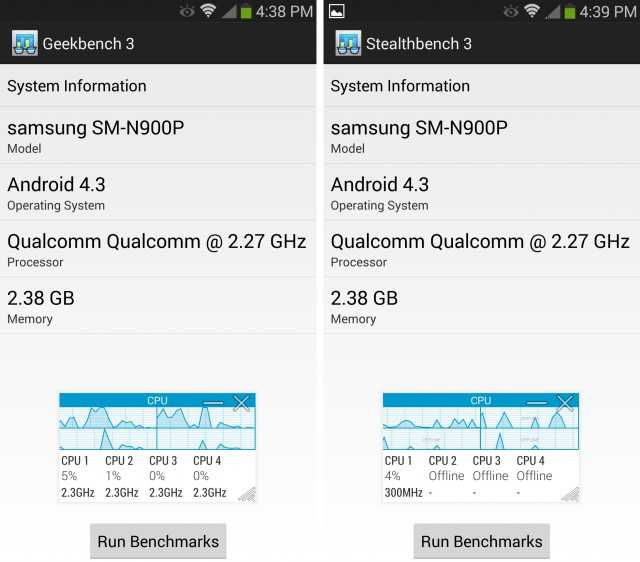 In pratica quando un Galaxy Note 3 riconosce che l’applicazione in esecuzione è un benchmark imposta i quattro core della CPU alla massima frequenza di 2.26GHz per tutta l’esecuzione dell’applicazione al contrario di una applicazione comune, che durante il periodo di ” riposo” mantiene solo un core attivo alla frequenza minima di 300 MHz con gli altri core spenti. Il tutto si traduce in risultati superiore addirittura fino al 50% rispetto al normale funzionamento del dispositivo.