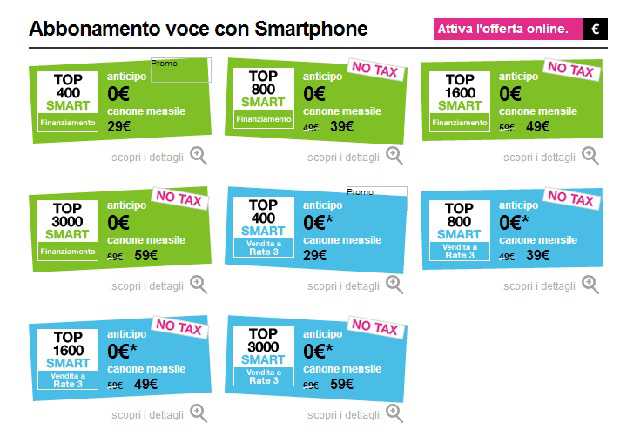Abbonamento: si va da TOP SMART 400 (€29 al mese senza anticipo, rata finale di €61 per 400 minuti 100 SMS e 2 GB) TOP SMART 3000 (€59 al mese senza anticipo, rata finale di €61 per 3000 minuti 600 SMS e 2o GB di traffico.) 59€ 3000 min 600 20 GB