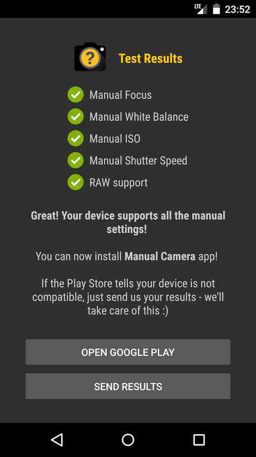 Per prima cosa analizzeremo se la nostra fotocamera sia stata aggiornata con le nuove features, grazie all’app Manual Camera Compatibility, scaricabile gratuitamente dal Play Store.