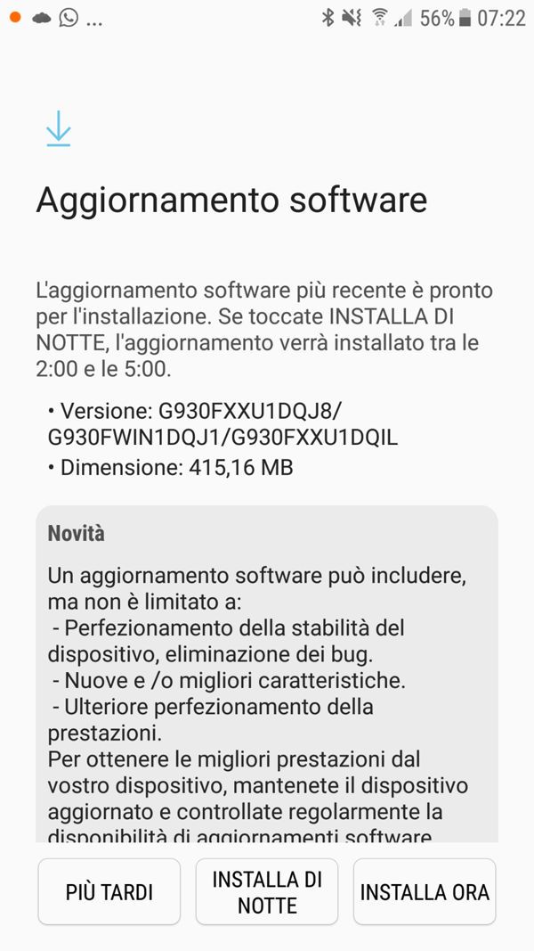 Il nuovo firmware G93xFXXU1DQJ8 disponibile per i Galaxy S7 e Galaxy S7 Edge brand Wind e Tim venduti nel nostro Paese è attualmente in fase di roll-out via OTA direttamente sui dispositivi interessati ed ha un peso complessivo di circa 415 MB ed introduce miglioramenti alla stabilità ed alle prestazioni generali del dispositivo.