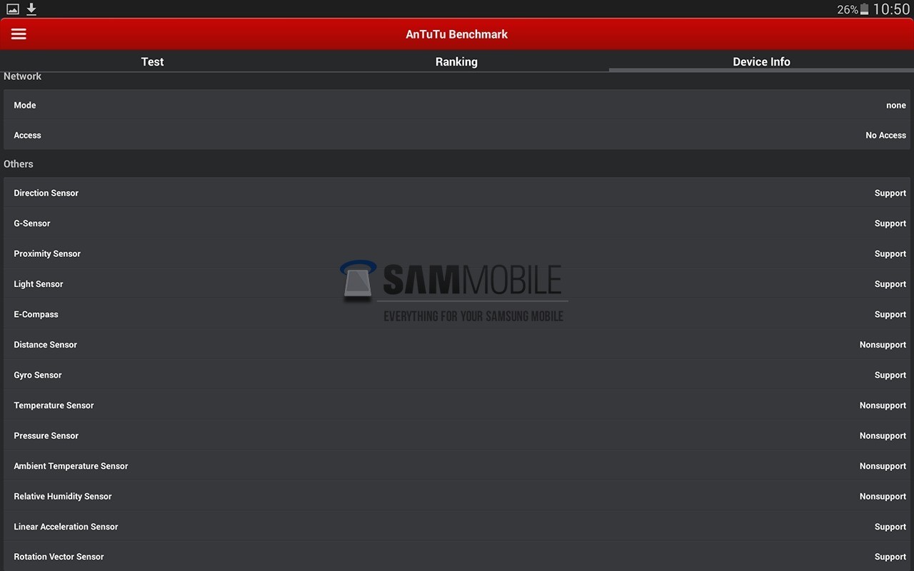 Le restanti caratteristiche tecniche vedono l’adozione da parte di Samsung di un display AMOLED con risoluzione WQXGA (2560×1600) , 3 GB di RAM dual-channel 933 MHz LPDDR3e, Fotocamera principale da 8 megapixel e frontale da 2.1 megapixel, Bluetooth 4.0, GPS, USB 2.0, Sensore di impronte digitali il tutto gestito dal sistema operativo Android 4.4.2 KitKat con interfaccia proprietaria TouchWiz.