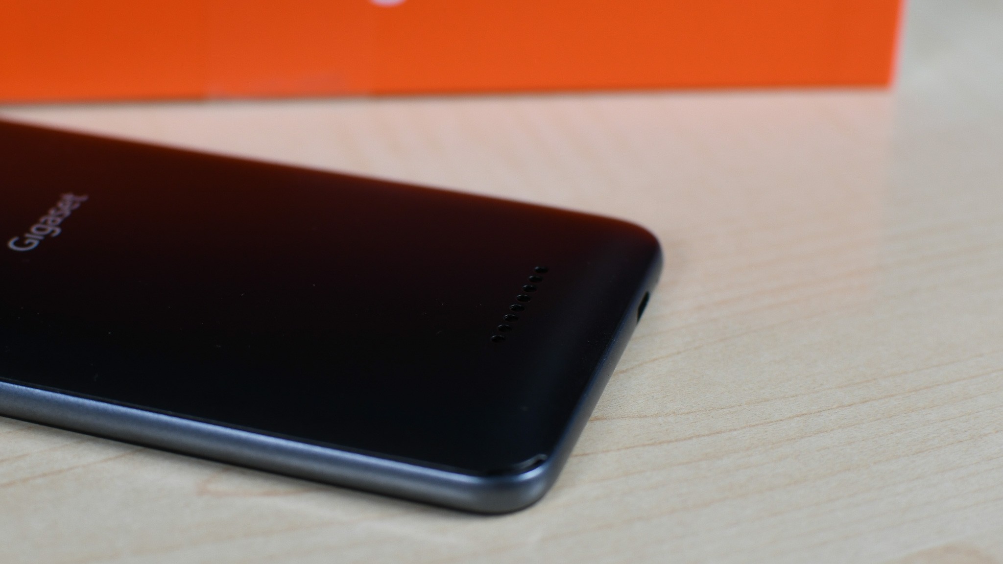 Sul retro troviamo allineati la fotocamera in alto con flash-LED, il sensore per il riconoscimento delle impronte digitali (abbastanza rapido e preciso), il logo Gigaset ed in basso lo speaker principale, un po scomoda la sua posizione in quanto il suono viene soppresso quando poggiato su di un piano.