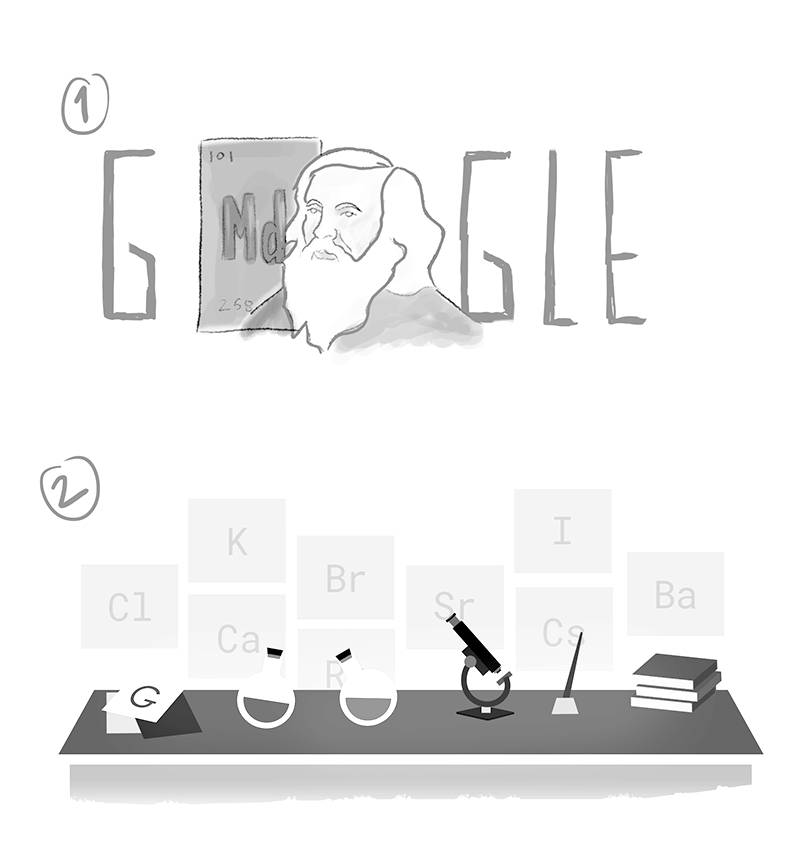 Dopo le varie idee sviluppate dall’artista e Doodler di Google, Robinson Wood, che inizialmente aveva pensato di inserire Mendeleev e l’elemento oggi conosciuto come mendelevio all’interno del logo Google, oppure mostrare la famosa scrivania sulla quale Mendeleev lavorava e veniva spesso fotografato. Alla fine l’artista ha però optato per posizionare Mendeleev in posa con la sua tavola periodica.