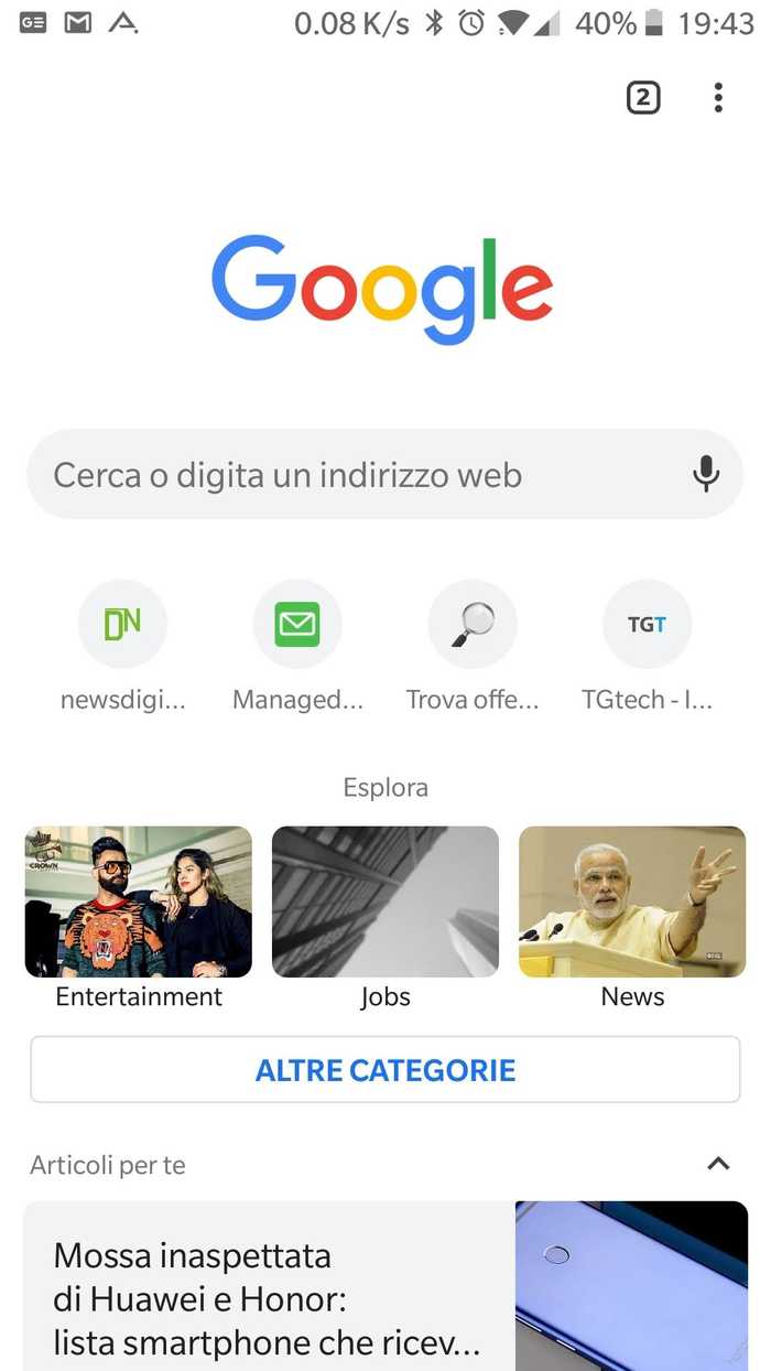 Non vi aspettate una rivoluzione dal nuovo Google Chrome Android, i suggerimenti che vedete in basso e che potete scorrere, delle notizie selezionate per il vostro profilo, sono già visibili nel Google Feed, quindi si tratta al momento solo di una sua estensione.Più interessanti invece sono le categorizzazioni che appaiono se clicchiamo su “Altre Categorie”subito prima dei suggerimenti.