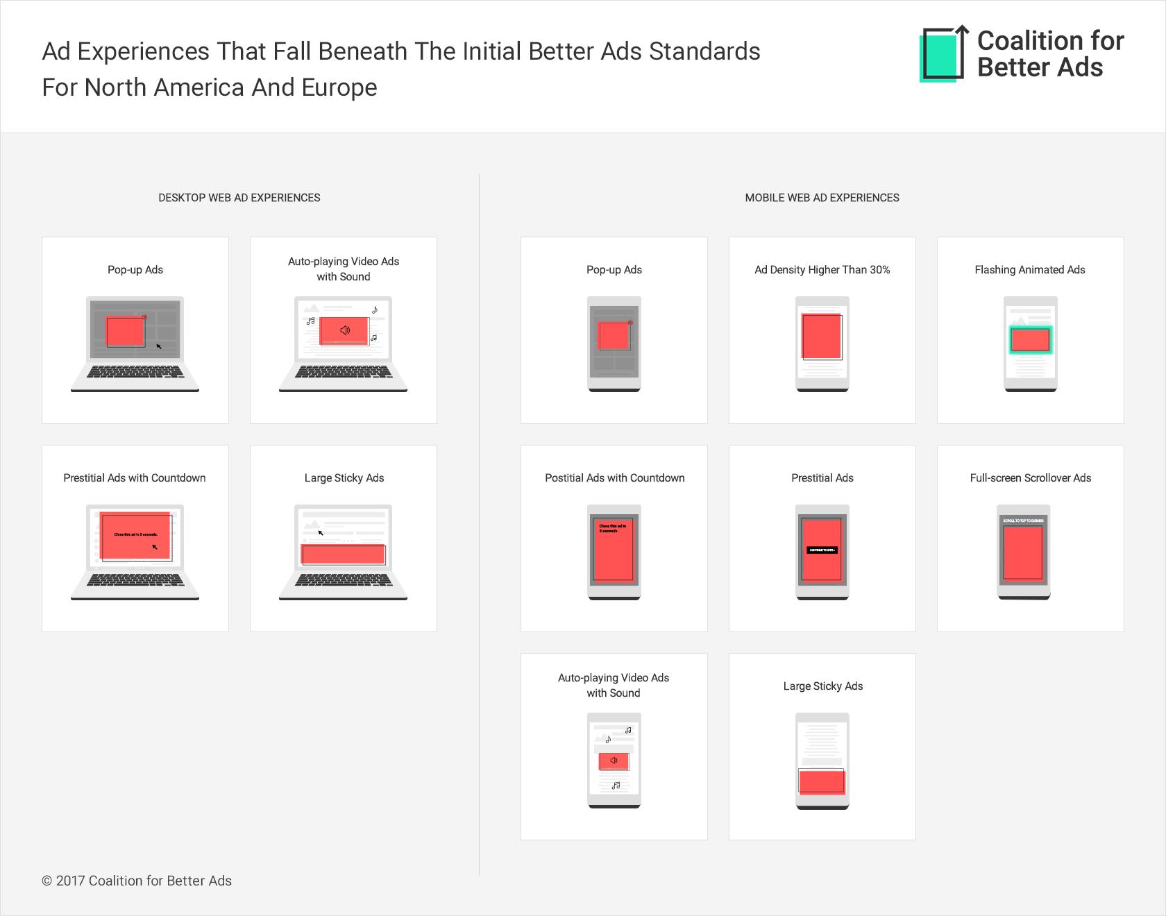 Coalition for Better Ads ha pubblicato anche delle linee guida illustrate che mostrano il funzionamento dei banner ritenuti invasivi, e tra questi possiamo evidenziare i tradizionali popup a tutto schermo, spot con riproduzione automatica dell’audio e tante altre tipologie di ad che possono rendere la navigazione tediosa.