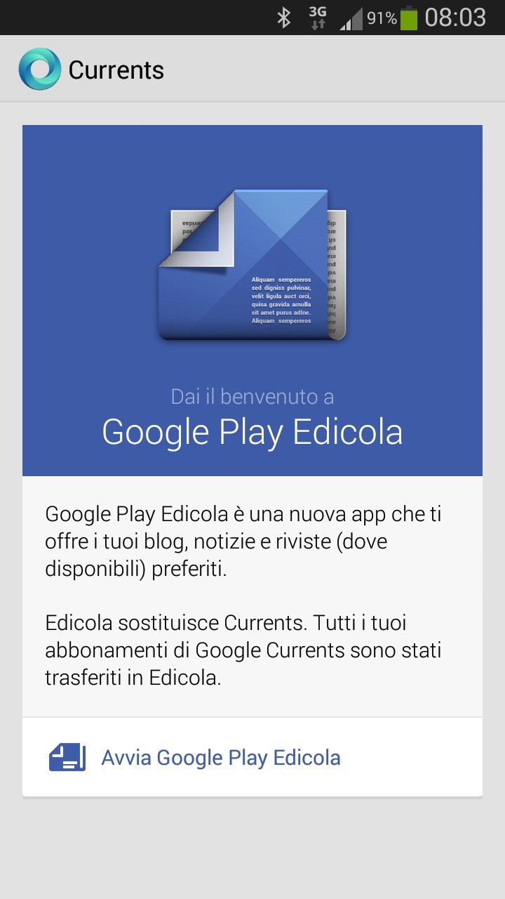 Google Currents ha infatti ricevuto un aggiornamento in questo ore che consiste nel segnalare agli utenti che lo avvieranno la fine del servizio consigliando l’avvio del nuovo Google Play Edicola ed inibendone tutte le ulteriori funzionalità ma non solo, in quanto dopo aver mostrato questa schermata, l’applicazione di Currents verrà rimossa quasi completamente dal dispositivo, rimuovendo dati, cache ed addirittura l’icona dal launcher, riducendo il pacchetto installato da circa 5.4 MB a soli 840 KB.