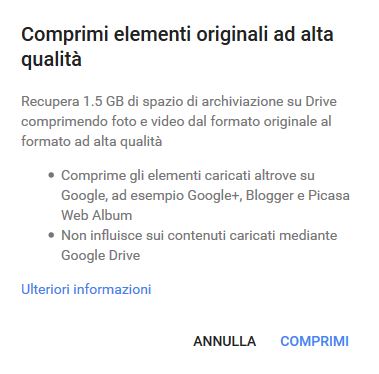 Da oggi però, grazie ad un aggiornamento già disponibile per la versione web di Google Foto, gli utenti potranno optare per l’utilizzo della modalità di archiviazione illimitata “alta qualità”, sfruttando l’algoritmo di compressione di Google anche per le foto già memorizzate in precedenza in modalità “qualità originale”. Per accedere a questa nuova funzionalità è sufficiente accedere a questo link, selezionare “Recupera Spazio di Archiviazione” e premere il tasto “Avvia”.