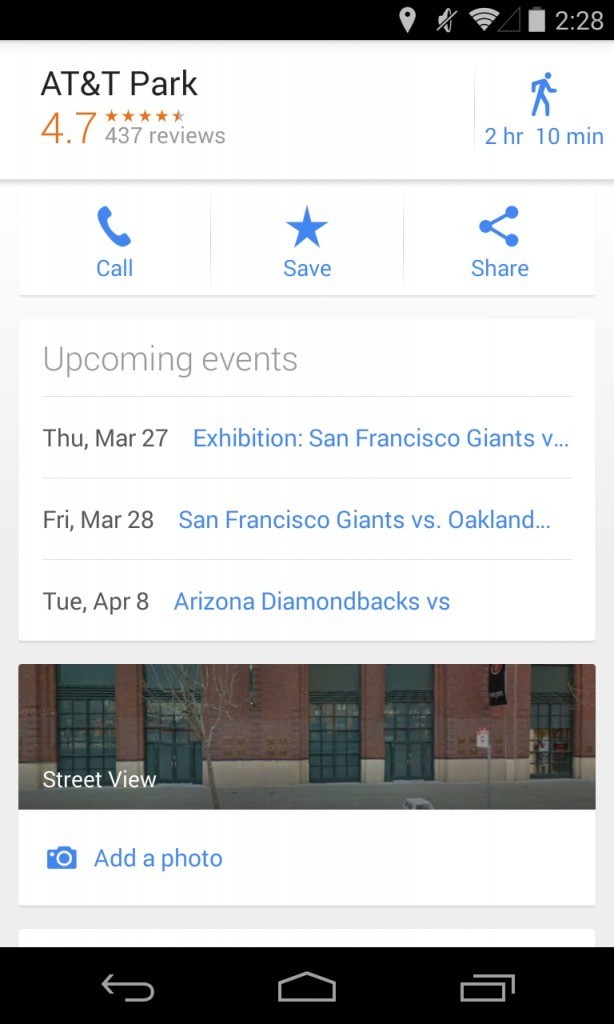 • Nella nuova versione di Google Maps ci sono ora i “Prossimi eventi“, praticamente degli annunci inseriti nelle liste di alcune località. Guardando l’esempio seguente nella foto, la ricerca di “AT & T Park” di San Francisco, mostra oltre al luogo, anche una lista degli eventi che ci saranno in quel posto.