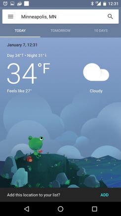 La nuova scheda non solo stravolge completamente il design, ma aggiunge anche interessanti e utili funzionalità che verranno sicuramente gradite dagli utenti una volta che Google rilascerà questa inedita versione. Una su tutte sembra il colore in background che varia al variare dell’ora del giorno (mattina, pomeriggio, sera, notte) e l’inserimento di personaggi e paesaggi in stile cartone animato (nell’esempio, c’è una simpatica ranocchietta verde) che cambiano a seconda delle condizioni meteorologiche (pioggia,sole,temporale,nebbia etc.).