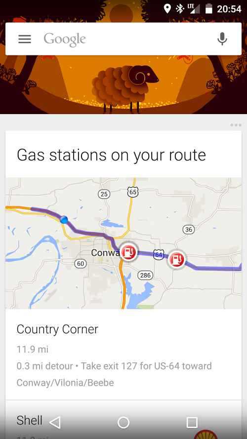 Google Now continua a migliorarsi per essere sempre più utile ai suoi utilizzatori; l’ultima aggiunta al servizio di assistenza personale è una scheda che mostra le stazioni di servizio trovate vicino e sul proprio percorso di viaggio.
