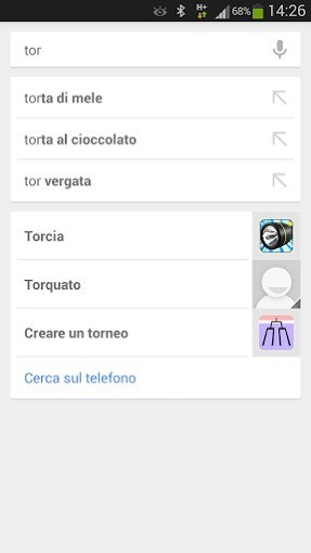 Altra novità legata sia ai comandi vocali che alla semplice ricerca testuale effettuata attraverso Google Now, riguarda i contenuti presenti sul dispositivo e nel Play Store; digitando ad esempio le lettere “Tor“, potrebbero essere mostrati, come potete vedere nell’immagine sottostante, le applicazioni installate sul dispositivo “Torcia” e “Creare un torneo”, ma anche il contatto “Torquato”, ma non solo in quanto pronunciando la frase “Ok Google, avvia Torcia“, Google Now avvierà l’applicazione per noi. Se poi l’applicazione cercata non è presente nel dispositivo, una delle schede di Google Now mostrerà le informazioni ed il link per accedervi attraverso il Play Store.