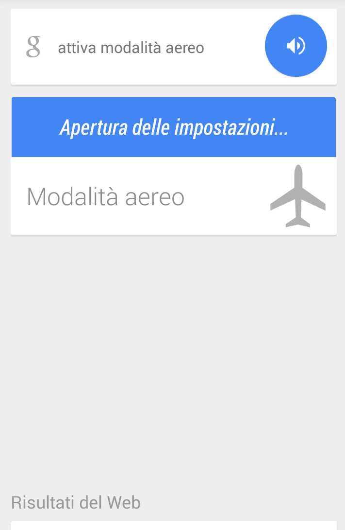 Tra le tante novità disponibili nella versione italiana di Google Now, troviamo il nuovo comando vocale che consente di avviare le varie funzionalità per le impostazioni di sistema, così pronunciando ad esempio la frase “Ok Google, attiva Wi-Fi“, piuttosto che la frase “Ok Google, attiva la modalità Aereo“, Google Now avvierà l’apertura dell’impostazione relativa alla funzionalità indicata.