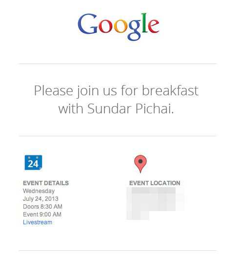 Google ha iniziato ad inviare gli inviti per l’evento del 24 Luglio chiamato “breakfast with Sundar Pichai”. Si tratta di un evento che si terrà a San Francisco, Calif con Sundar Pichai capo della sezione Chrome e Android. Si potrebbe pensare quindi ad un evento che introdurrà novità per quanto riguarda Android, come la presentazione sella release 4.3, oppure del nuovo tablet ASUS Nexus, o del nuovo Motorola Moto X o magari di tutti questi messi insieme! L’evento, per chi non potesse essere a San Francisco, sarà trasmesso live su YouTube. Non ci resta quindi che aspettare il 24 Luglio per vedere cosa accadrà!
