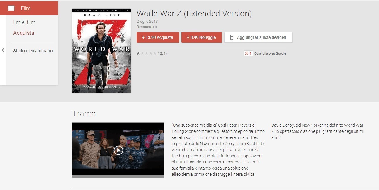 Finalmente da pochi minuti è sbarcato in Italia il servizio Google Play Film che va a completare quasi completamente il quadro dei servizi Google Play in Italia rispetto agli Stati Uniti, dove in più rispetto a noi possono anche usufruire del Google Play Magazine dove acquistare riviste e quotidiani.