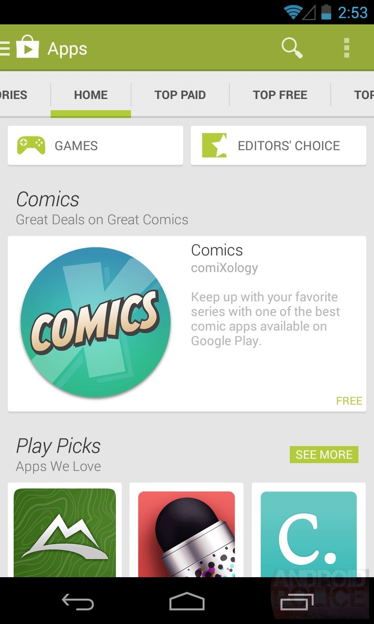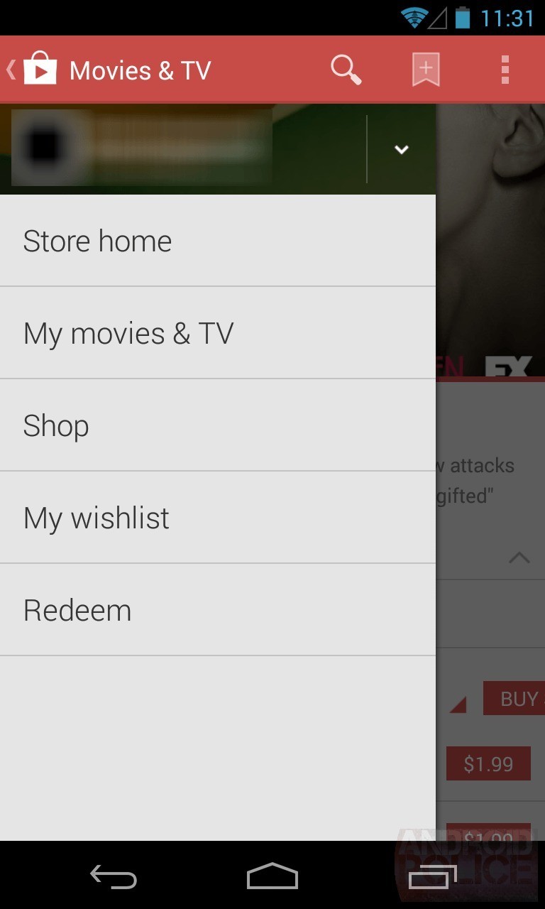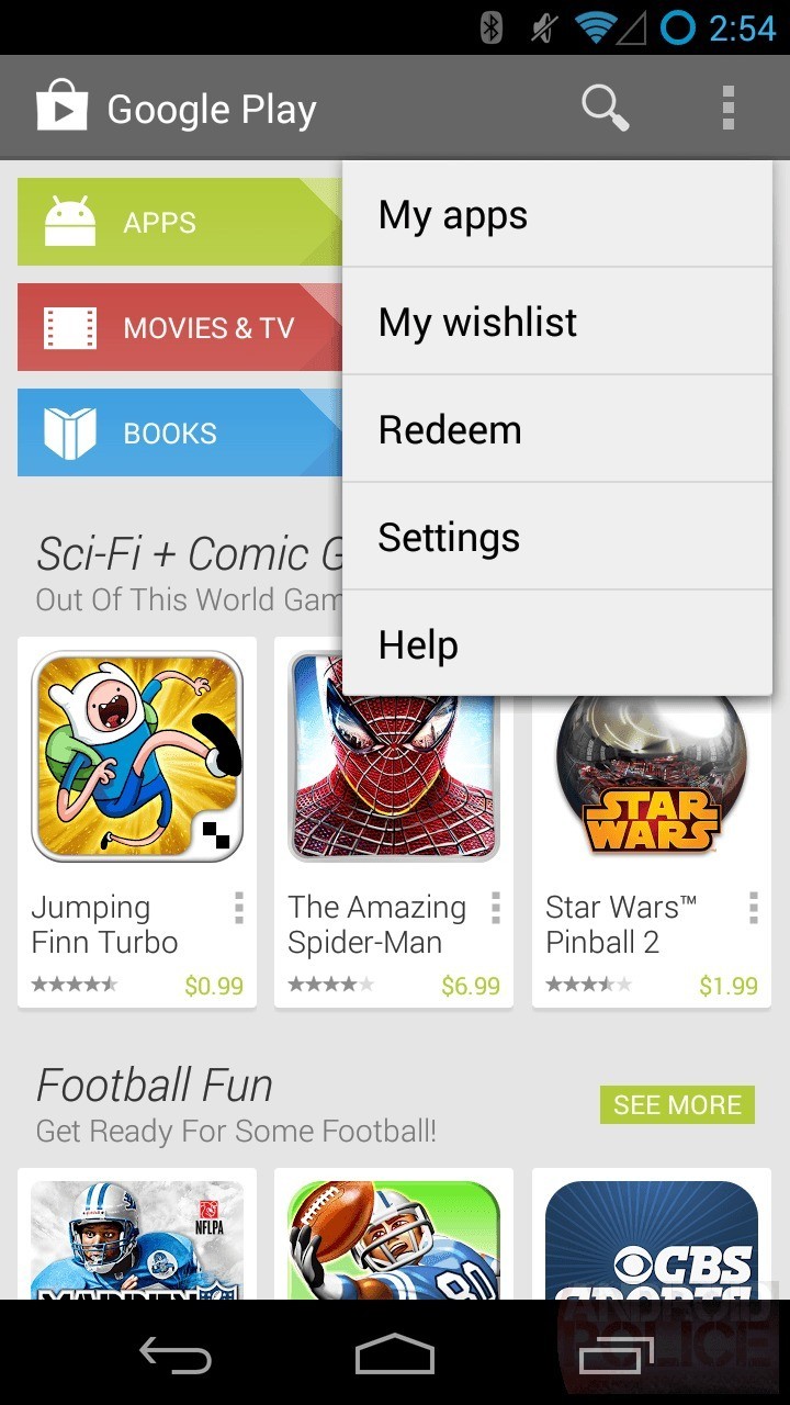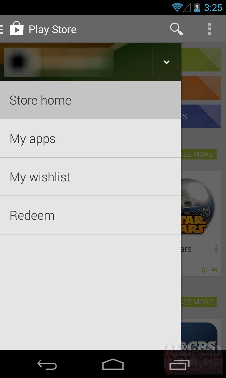 Questa scelta ha portato inoltre alla realizzazione di un apposito tasto, questa volta sul lato destro, per l’acceso alle Impostazioni del Play Store ed alla Guida. Le immagini inoltre sono state catturate da una versione non definitiva del nuovo Google Play Store 4.4 che al momento del debutto dovrebbe essere dotato anche di un nuovo layout per quanto riguarda i contenuti, con una suddivisione in schede simili a quelle di Google Now.
