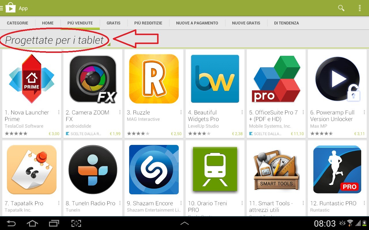Da questa mattina infatti provando ad accedere alla sezione App del Google Play Store da un tablet Android, visualizzando le varie sotto categorie, verranno mostrate in evidenza le applicazioni “Progettate per i tablet” ed inoltre, sempre da tablet, tutte le applicazioni non ottimizzate nella grafica e nel layout per schermi di grandi dimensioni verranno identificate (e di conseguenza penalizzate) con la scritta “Progettata per i telefoni“.