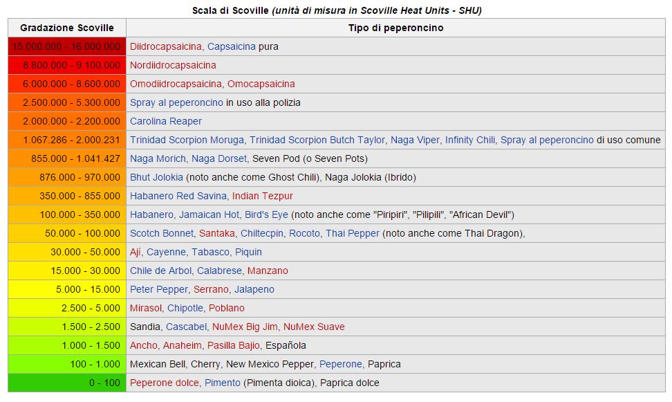 Come riportato da Wikipedia, la Scala Scoville, ideata dal chimico Wilbur Scoville, misura la piccantezza di un peperoncino il cui interno contiene alcune sostanze, dette capsaicinoidi, di cui la più abbondante è la capsaicina, un composto chimico che stimola i recettori del caldo, situati anche sulla lingua e che provoca la sensazione di “bruciore”.