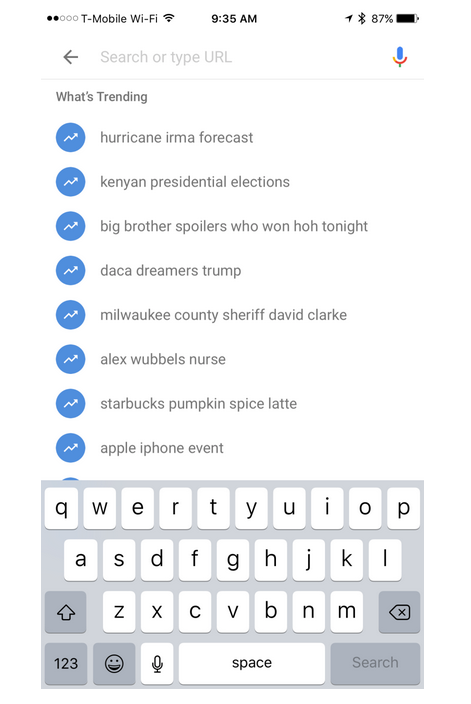 Nel primo caso, selezionando il form di ricerca, appaiono i maggiori Trend caratterizzati da un’icona blu. Nel secondo caso, invece, durante la digitazione della chiave di ricerca vi vengono suggerite le parole con cui completarla fornendo anche una risposta in tempo reale.