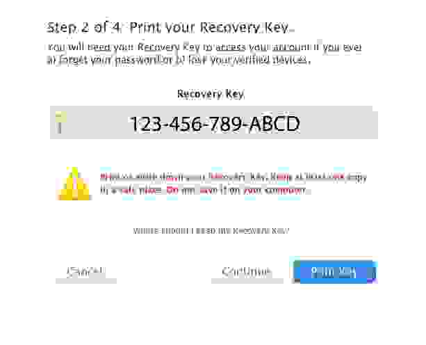 - Ora vi verrà data una chiave di ripristino che avrete bisogno di salvare in un luogo sicuro nel caso in cui si dimenticherà la password e non si dispone di un dispositivo verificato per ripristinarla. Vi suggeriamo di stamparlo e conservarlo al sicuro. Ne avrai bisogno per il prossimo passo quindi ricordatevi di salvarla prima di continuare.