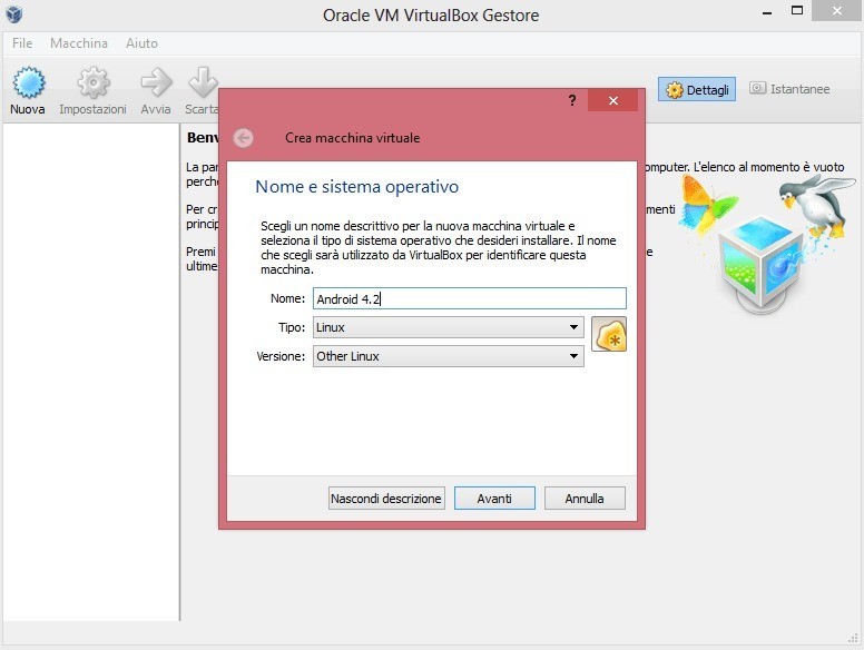 - Aprire VirtualBox e selezionare Nuova. Nel box inserire il nome che preferite e per il tipo di sistema operativo