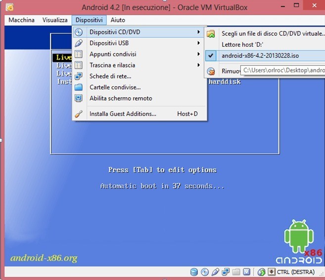 - Premete l’icona a forma di cd a destra e selezionate il file ISO di Android 4.2.2 e quindi premete Ok